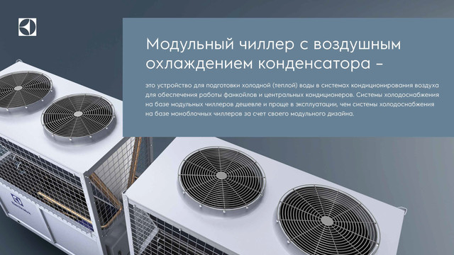Модульный чиллер Electrolux EMACO-440.V2 (EMASC-440.V2) - высокоэффективный агрегат с воздушным охлаждением конденсатора. Предназначен для кондиционирования помещений большой площади: офисные здания, гостиницы, торговые центры, школы, больницы, фабрики, складские и административно-хозяйственные помещения. Устанавливается снаружи здания (на прилегающей территории или на крыше). Работает на озонобезопасном хладагенте R410A.