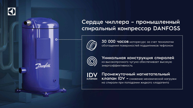 - герметичные спиральные компрессоры Danfoss А-класса с уникальной конструкцией спиралей из высокопрочного чугуна и промежуточным нагнетательным клапаном IDV, снижающим механическую нагрузку на спирали при попадании жидкого хладагента;
