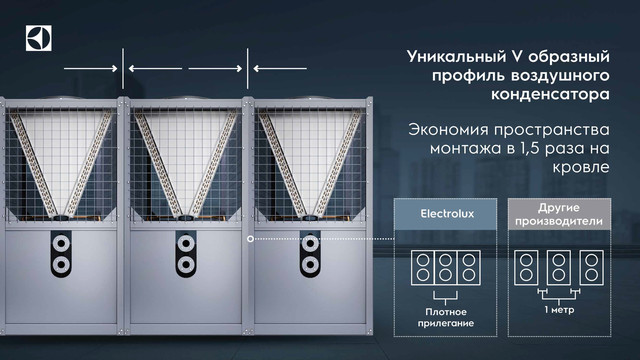 - уникальный V-образный профиль воздушного конденсатора, позволяющий экономить пространство монтажа на кровле в 1,5 раза;