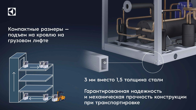 - компактные размеры, позволяющие экономить пространство для монтажа на 20% (возможна погрузка в грузовой лифт);