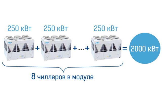 до 16 чиллеров в одном модуле: Чиллеры MDV серии Aqua Tempo Power можно объединять в модули в их стандартной комплектации, никакого дополнительного оборудования для этого докупать не требуется. Модульная конструкция чиллеров дает большие преимущества при монтаже, эксплуатации, техническом и сервисном обслуживании.